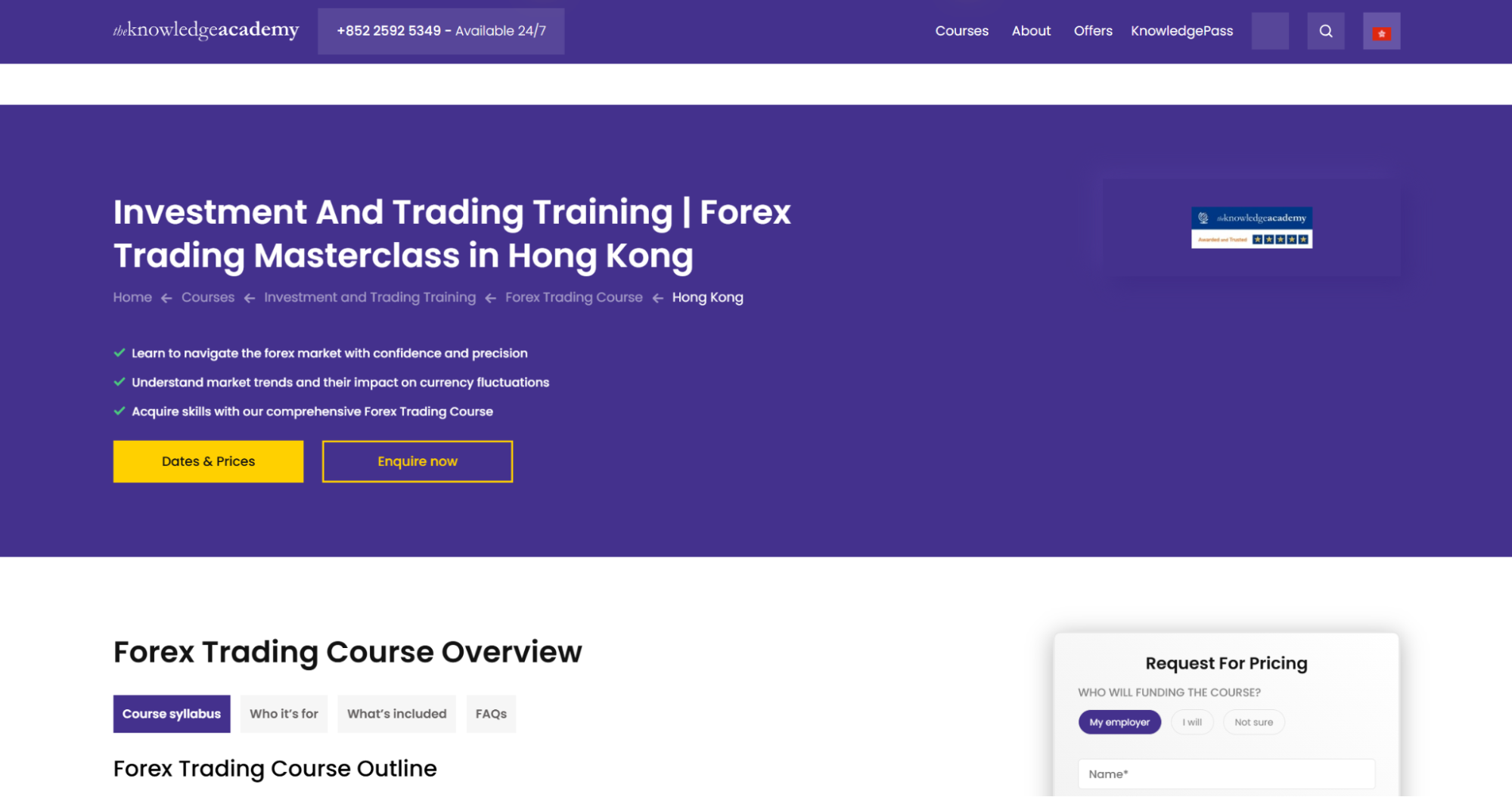 The Knowledge Academy offers a Forex Trading Masterclass in Hong Kong designed to help traders learn strategies, market analysis, and risk management skills for profitable currency trading. The course focuses on helping participants understand market trends and their impact on currency fluctuations while building confidence in trading decisions. Students learn to read forex markets with precision and apply comprehensive trading strategies.