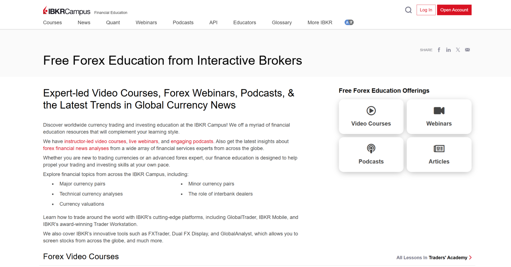 Interactive Brokers provides free forex education through IBKR Campus, featuring instructor-led video courses, live webinars, and engaging podcasts. The program is designed to help traders at all levels, from newcomers to advanced forex experts, develop their skills at their own pace. Educational content covers major and minor currency pairs, technical currency analysis, and the role of interbank dealers.