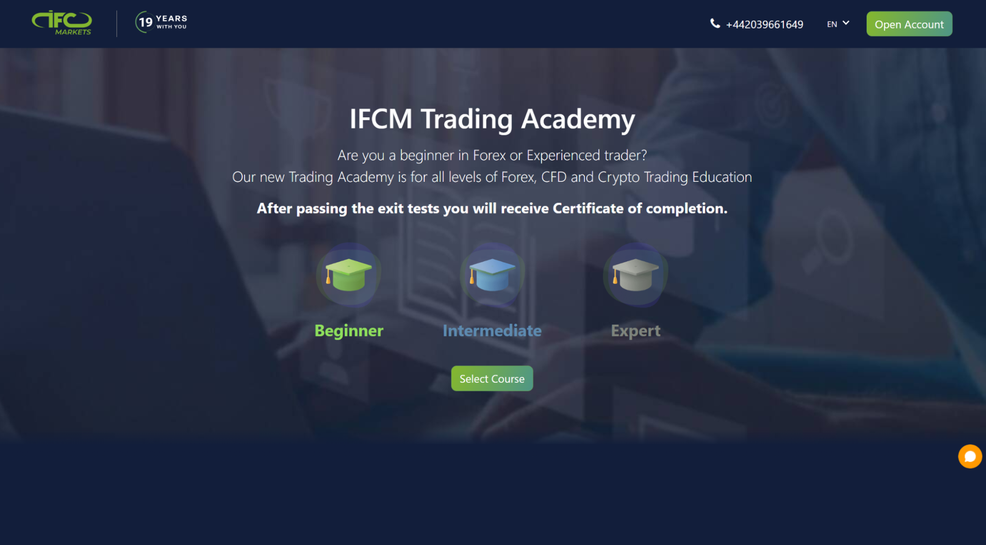 IFCM Trading Academy provides comprehensive forex, CFD, and crypto trading education for all skill levels from beginners to experienced traders. The academy offers structured courses with exit tests and certificates of completion upon finishing the program. Students can access free online education designed as a fast and suitable way of learning financial markets.