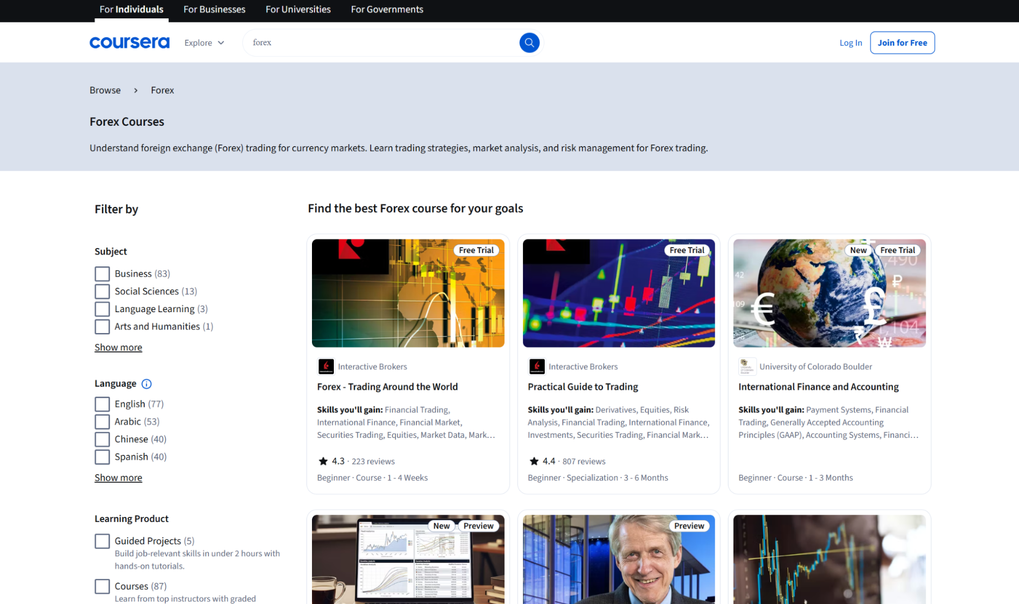 Coursera offers university-partnered forex courses including "Forex - Trading Around the World" and programs from institutions like Yale and the University of Geneva.   Key Features: