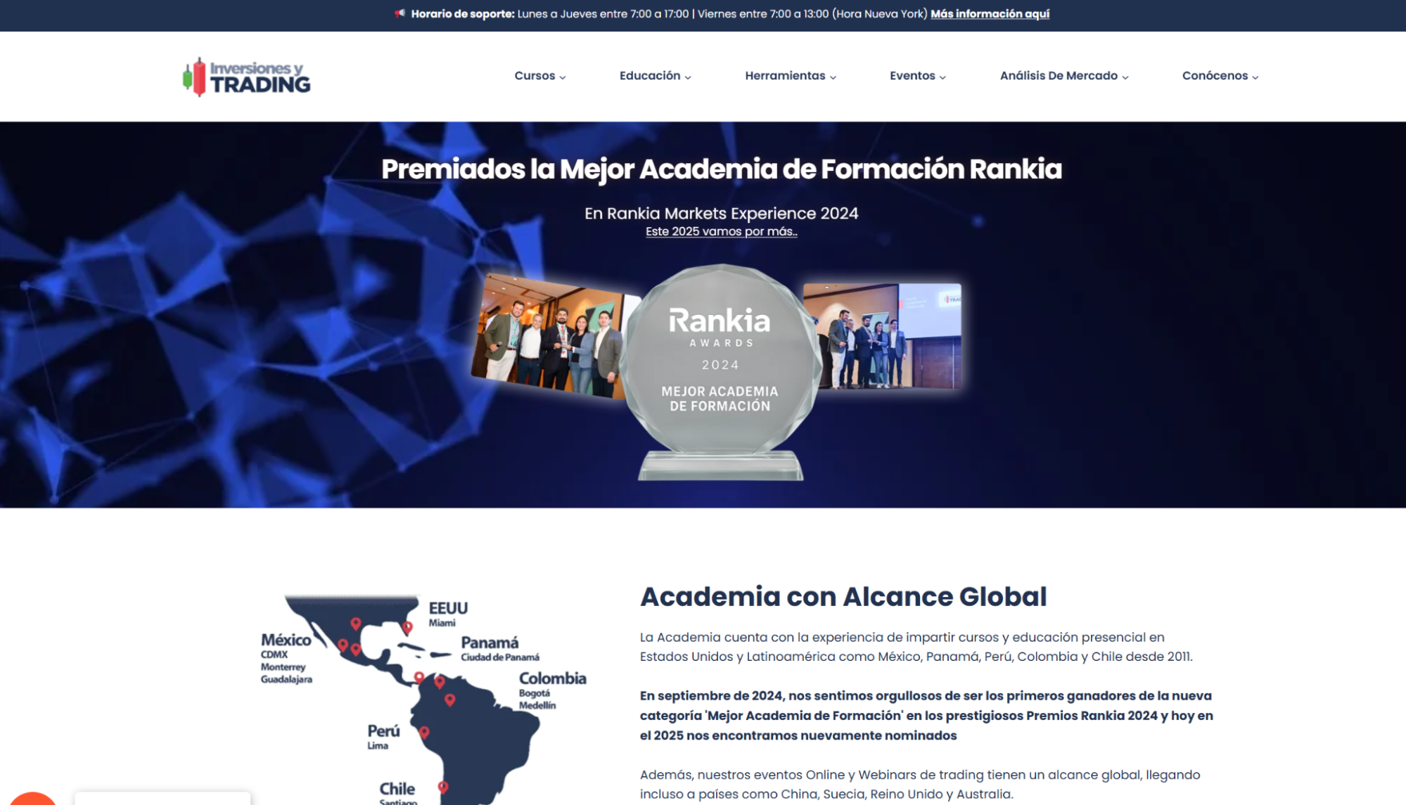 Inversiones y Trading is a globally-recognized Spanish trading academy that won the prestigious “Best Training Academy” award at Rankia 2024. With trading education experience since 2011, this academy serves students across Latin America, United States, and Europe with specialized forex, stocks, and cryptocurrency training.