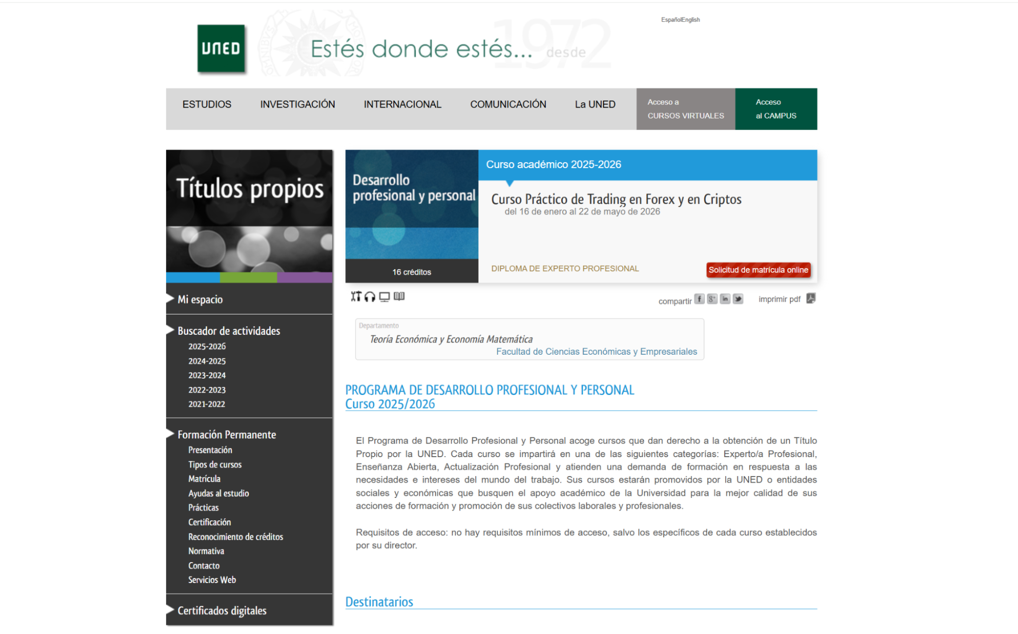 Most Spanish forex courses accept complete beginners with no previous trading experience. Academies like Traders Business School, Inversiones y Trading, and the UNED forex course specifically design entry-level programs for individuals starting from zero knowledge. These courses cover fundamental concepts including currency pair mechanics, platform navigation, chart reading basics, and risk management principles before progressing to advanced strategies. However, some specialized advanced courses or master's degree programs may require prerequisite knowledge or completion of foundational modules before enrollment.