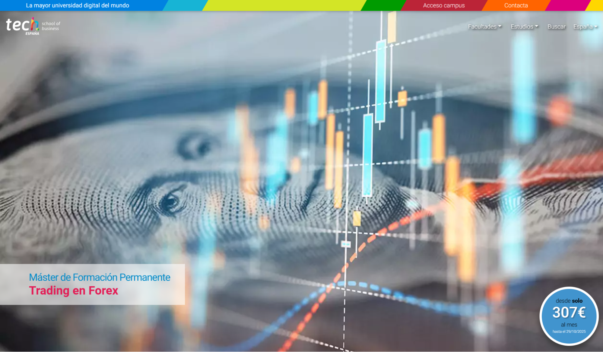 TECH Universidad Tecnológica offers a comprehensive Master's degree program in Forex Trading delivered entirely online, allowing Spanish students to learn from home with flexible scheduling. This accredited university program provides complete forex education from fundamentals to advanced strategies.