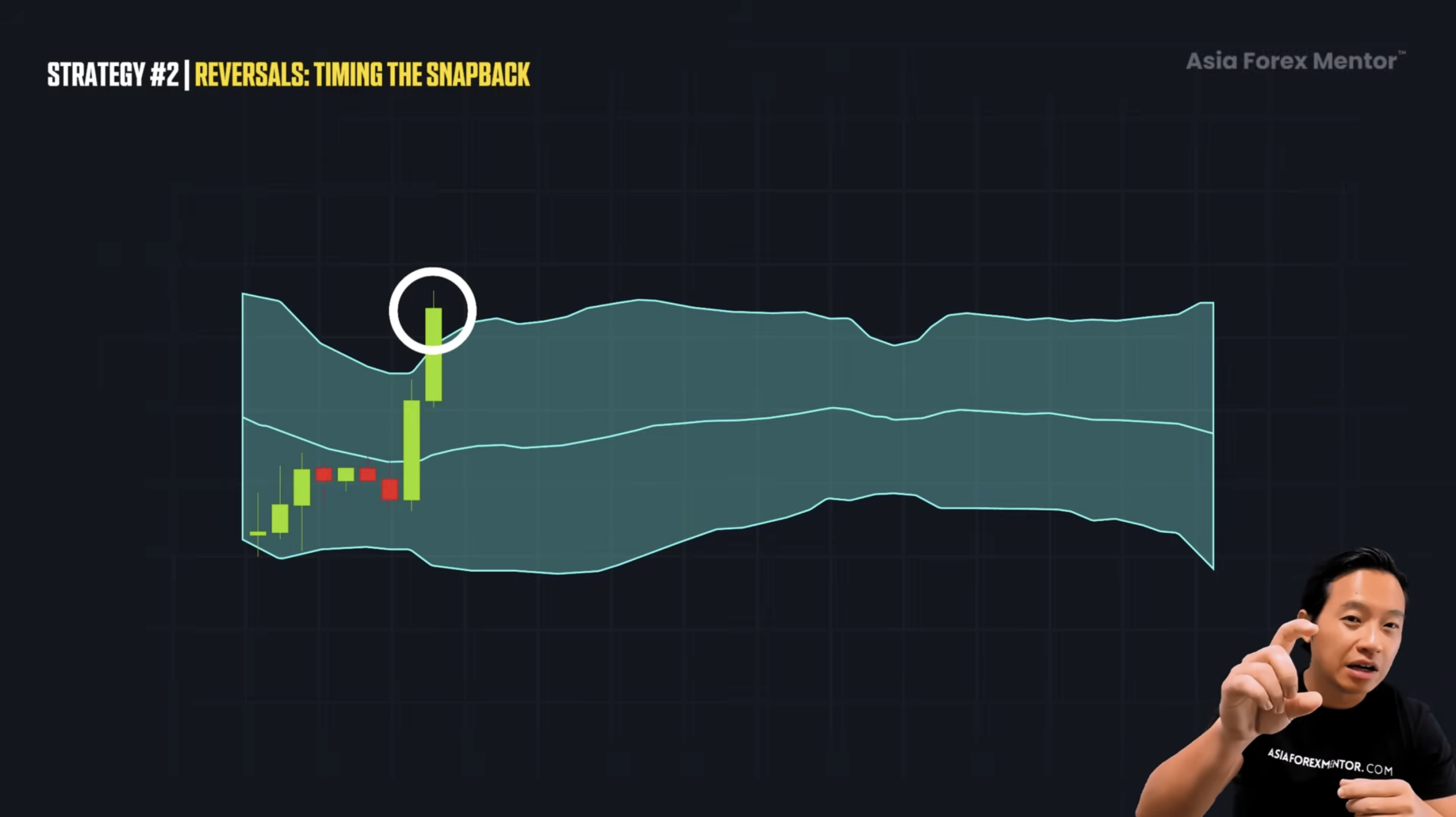Sometimes you’ll see a bar close above the band. And this is why we don’t jump in immediately. That move could be a breakout or it could be a fake move setting up a reversal.