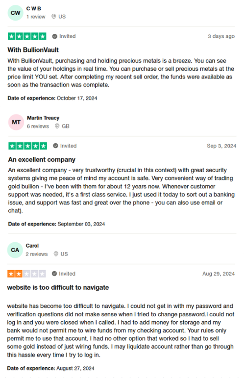 Customer reviews for BullionVault reflect both positive and negative experiences. Many users praise the platform for its ease of use in managing precious metals, including real-time visibility of holdings and fast access to funds after sales. Long-term customers appreciate its security and trustworthiness, with some relying on it for over a decade.