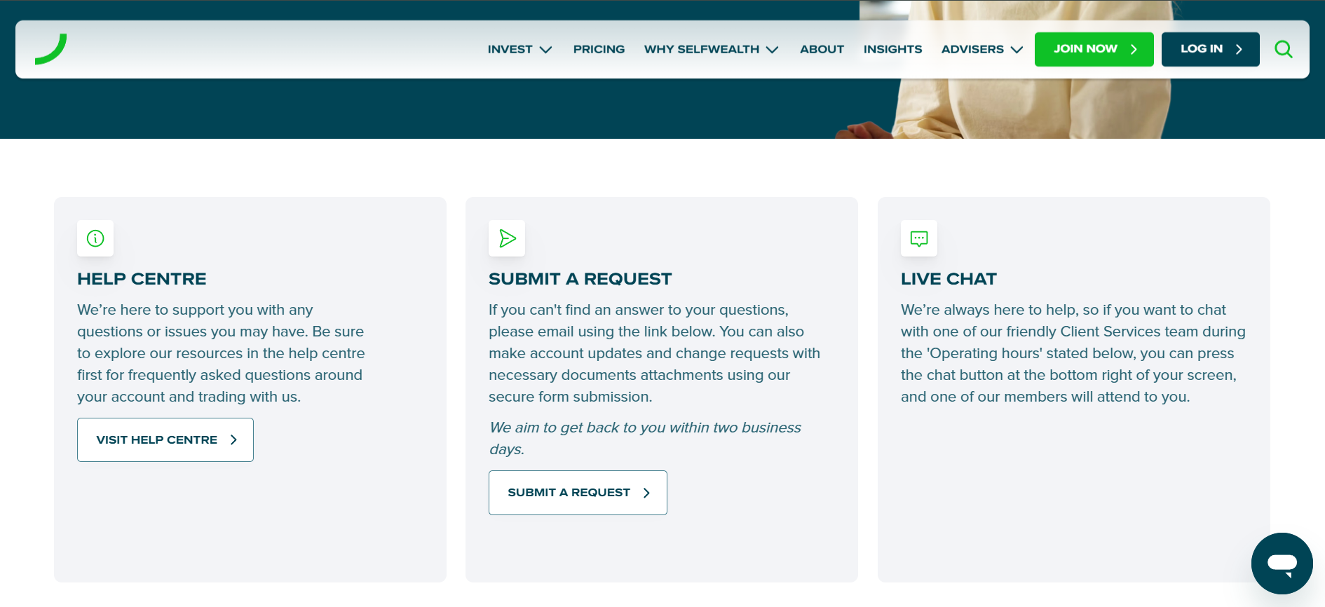 Selfwealth provides customer support through several online channels designed to help investors resolve account, trading, and technical issues efficiently. The primary support options include a Help Centre, live chat, and secure email request system, allowing users to contact the Client Services team directly from the platform. The Help Centre contains frequently asked questions and guides covering account setup, trading, deposits, and platform features, making it the first point of support for common inquiries. If further assistance is needed, users can submit a request through an online form, with responses typically provided within two business days.